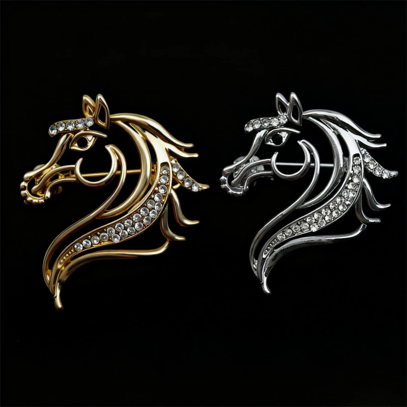 Elevate your style with our exquisite gold-plated horse head brooch, featuring dazzling rhinestone eyes and crystal mane accents. This fashion-forward accessory combines timeless elegance with contemporary design, making it the perfect statement piece for any occasion. Crafted with precision and attention to detail, this brooch adds a touch of sophistication to jackets, blazers, scarves, and handbags.